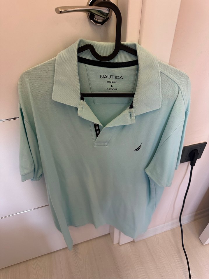 Nautica markalı, pamuklu, pastel mavi renkte, düğmeli yakalı, kısa kollu, bol kesim erkek polo tişört. Sokak stiline uygun rahat bir parça.