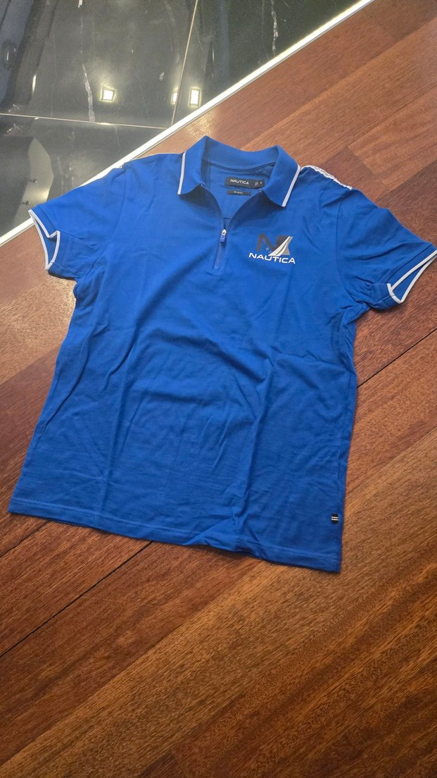 Nautica markalı, kısa kollu ve yakalı, fermuarlı ön detaylı, parlak mavi renkli, baskılı logolu, dar kesim erkek polo tişörttür.