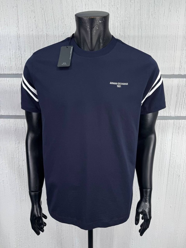 Navy renkli, kısa kollu, yuvarlak yakalı Armani Exchange erkek tişörtü. Sentetik kumaştan, günlük kullanıma uygun, rahat kesim ve kol detaylarında şerit baskılar bulunur.