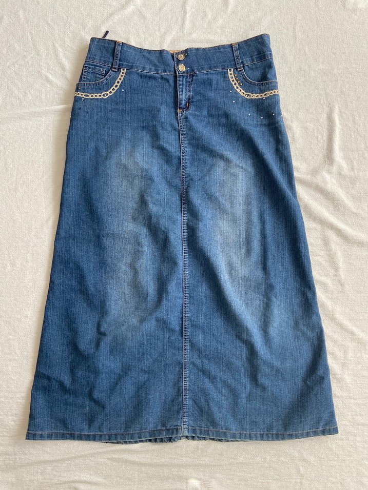 Navy renkli denim midi uzun etek, bol kesim ve bohem tarzıyla ceplerinde dekoratif detaylar bulunur. Günlük kullanım için rahat ve şık bir seçim. Uzun kot etek işlemeli boncuk detaylı vintage etek