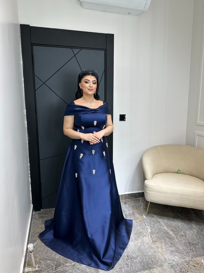 Navy renk, drapeli uzun abiye elbise, tekne yaka ve kısa kolludur. Parlak yüzeyi ve etnik desenleri ile klasik şıklık sunar, düğün için uygundur. Bi kere giydim nişanımda