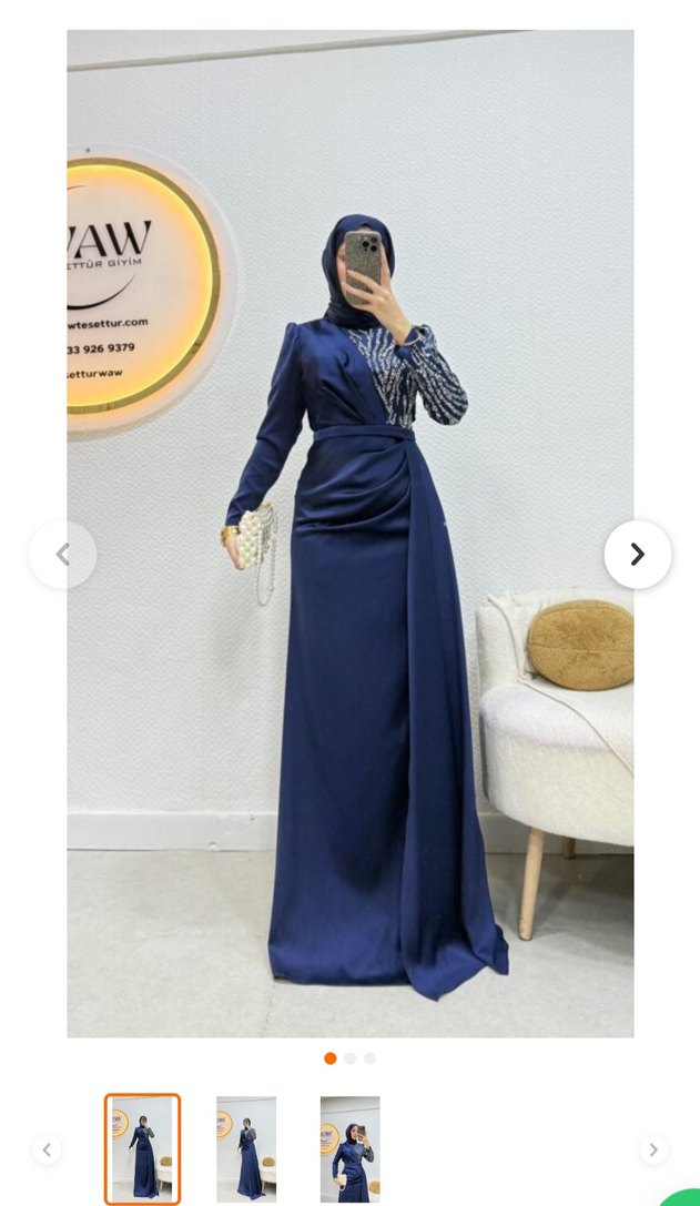 Navy renkli, parlak batik desenli, uzun kollu ve V yakalı drapeli uzun abiye elbisedir. Düzenli kesimle modest tarzı yansıtır. AW markası bulunur. ✨ sıfır denemek için giydim omuz kısmı biraz dar 64kiloda denedim
