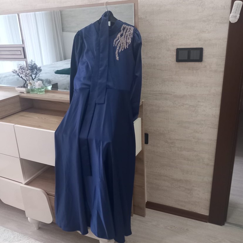 Navy renkli, drapeli uzun kol ve notched lapel yakalı kadın abiye elbise. Omuzda nakış detayı bulunan, regular fit ve minimalist tarzda, ofis için uygun.