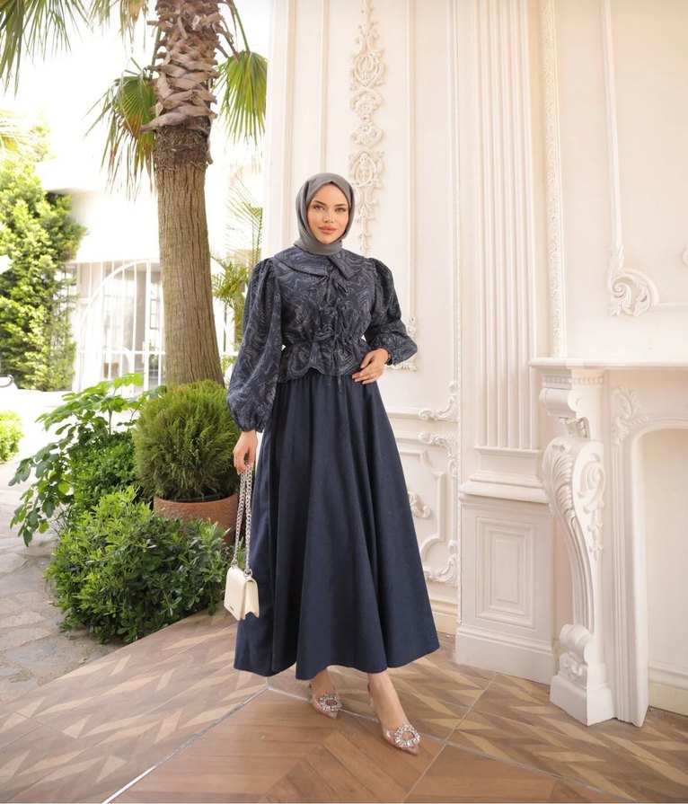 Navy renkli, etnik desenli, uzun kollu ve fırfırlı detaylara sahip regular fit uzun etekli takım Sentetik kumaştan, günlük tesettür kullanıma uygun. 1 kere kullandım bol geldiği için satıyorum