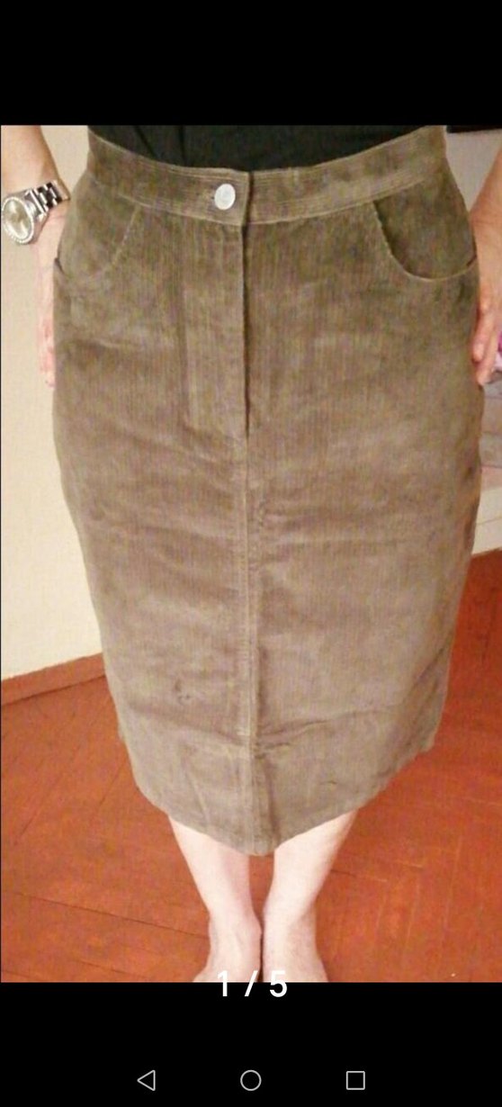 Düğmeli ön kısmı ve midi boyu ile bej Kadife etek, rahat normcore tarzıyla ofis için uygundur. #etek#kadifeetek#