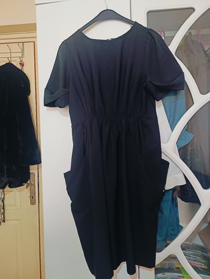 Navy midi hamile elbisesi, kısa kollu ve salaş kesim. Nefes alabilen keten kumaştan yapılmıştır. Drapeli tasarım ve yuvarlak yaka ile minimalist görünüm sunar. Günlük kullanım için uygundur.