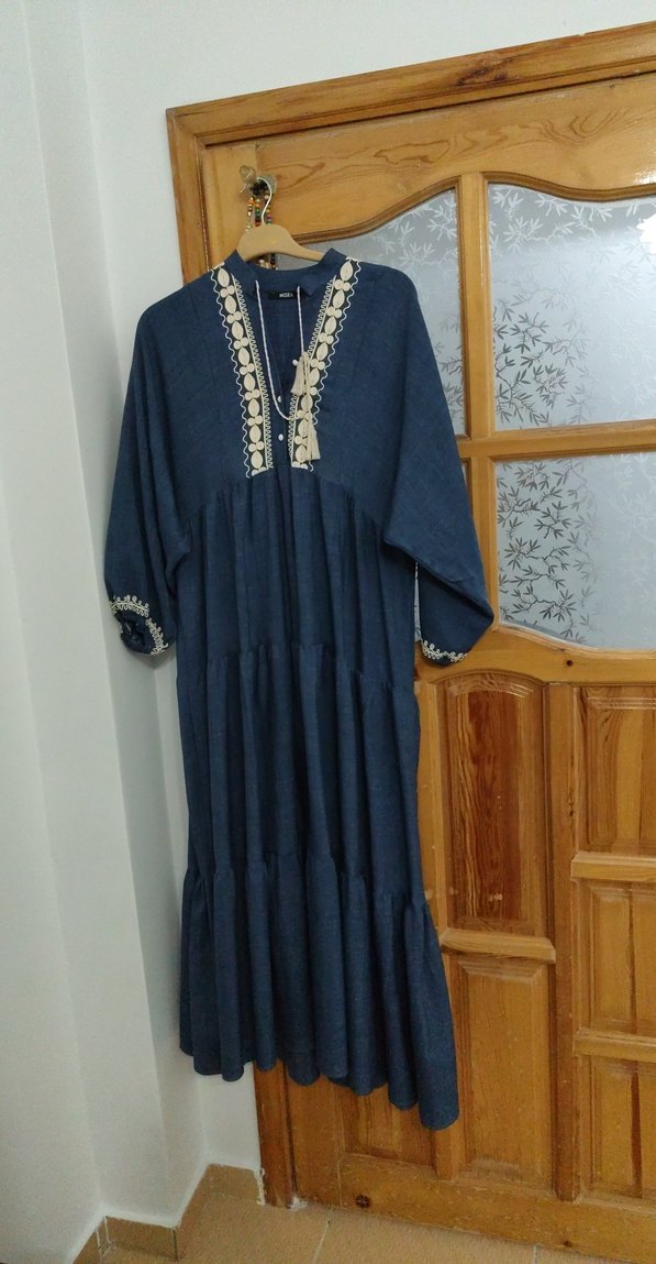 Navy renkli, nakışlı ve püsküllü uzun, bol kesim denim elbisedir. V yaka ve uzun kolludur, bohem tarzını yansıtır.