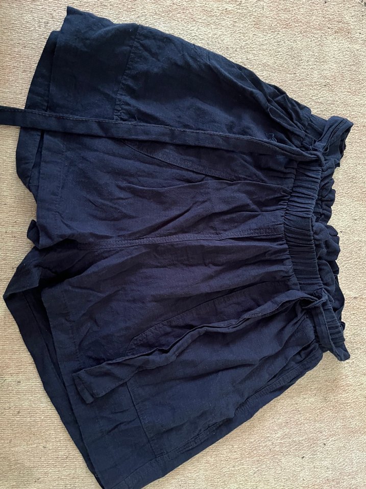 Yumuşak keten kumaştan, bol kesim ve mini boyda, fırfırlı detaylı navy renk hamile şortu, günlük rahatlık için uygundur.