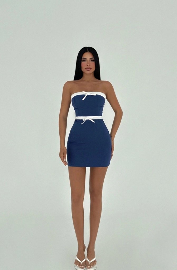 Bu fitted navy denim mini elbise, beyaz detaylı straplez yakaya sahiptir. Cesur ve minimalist tarzıyla romantik akşamlar için uygundur. Strappy tasarımı sokak modasına zarif bir dokunuş katar.