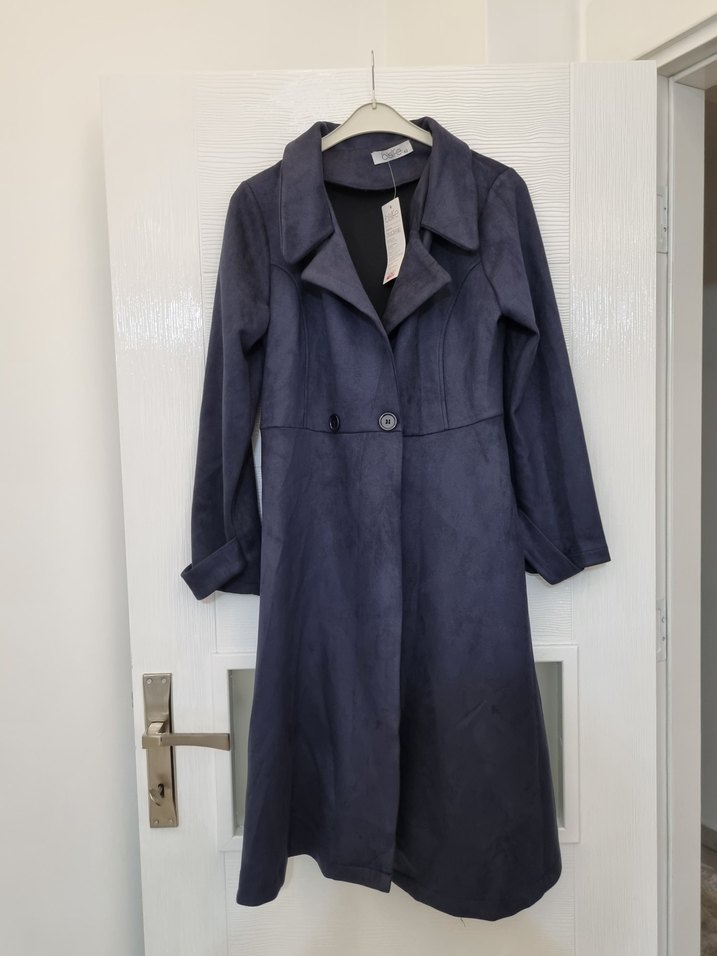Navy mavisi süet kumaştan uzun kadın trençkot, yakası açık ve düğmeli. Ofis ve günlük kullanıma uygun, rahat kesimli ve desensiz model.