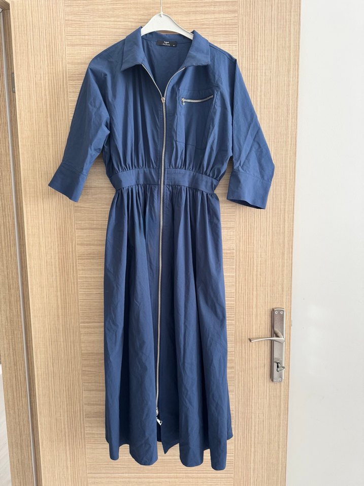 Navy Uzun Keten Elbise Fermuarlı
