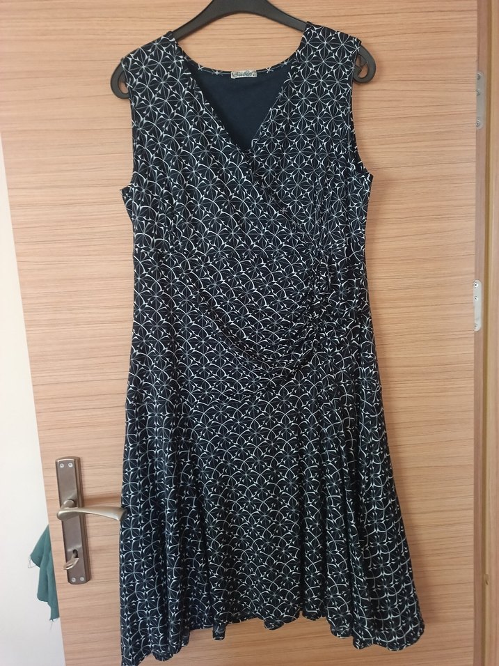 V yakalı, kolsuz, piliseli midi boy elbise. Rahat kesimli, yumuşak sentetik kumaştan, lacivert ve gri renklerde bohem tarzda günlük kullanım için uygun. sayılı giyilmistir