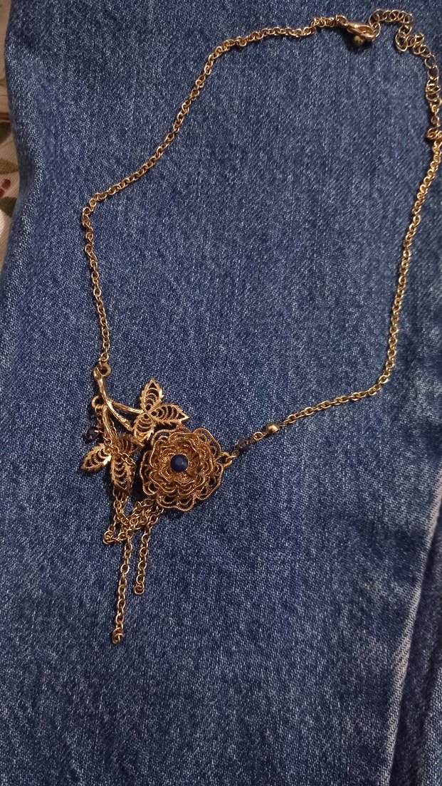 Uzun boylu, zincir detaylı vintage bohem tarzda kadın kolyesi. Nakışlı çiçek deseni ve parlak navy detaylarla günlük kullanıma uygun.