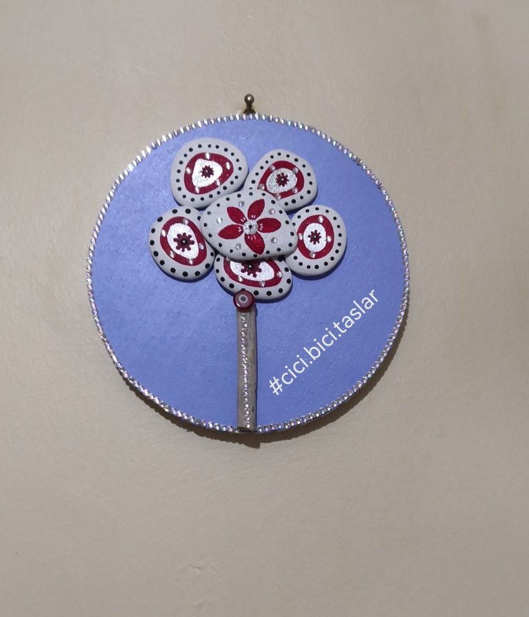 Mavi zemin üzerine deniz taşlarından özel tasarım ağaç tablo. 15 cm çapındadır. El yapımıdır. Duvara asılır. #cici.bici.taslar