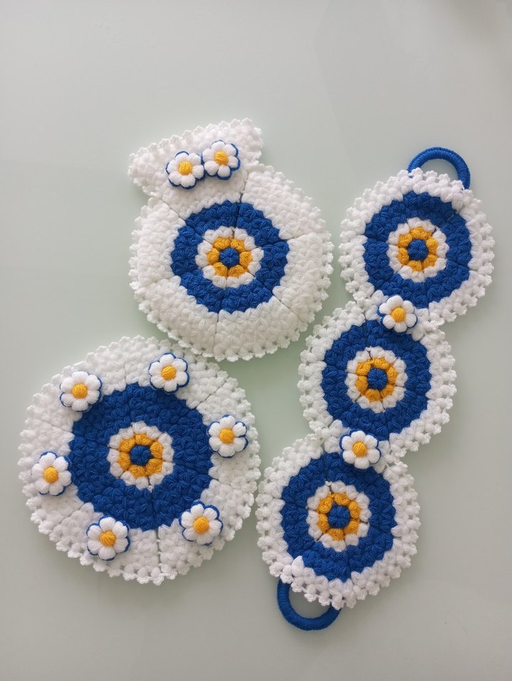 Mavi beyaz nazar boncuğu desenli, küçük çiçek detaylı el örgüsü set. Yuvarlak ve uzun parçalar içerir.