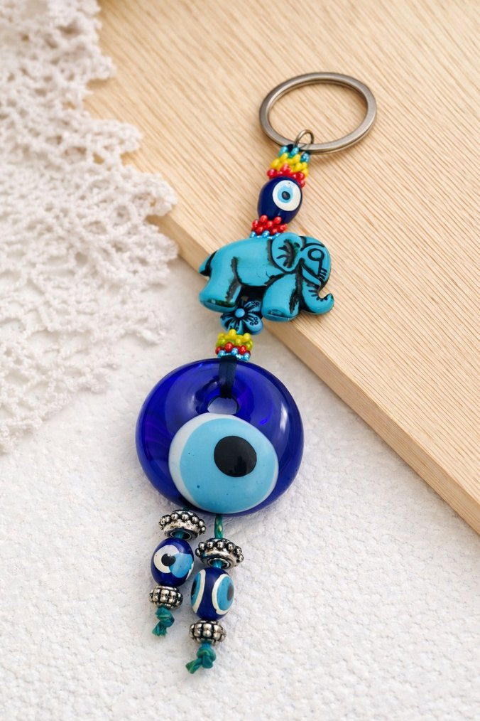 Mavi fil ve nazar boncukları içeren renkli boncuklu anahtarlık, bohem tarz için uygundur. Nazar Boncuklu Fil Figürlü El Yapımı Anahtarlık Hediye olarak gelmiştir, hiç kullanılmamıştır. El yapımı detaylara sahip, nazar boncuklu ve fil figürlü şık bir anahtarlıktır. Fil figürü bereketi, nazar boncuğu ise koruyucu enerjiyi simgeler. Anahtarlık, çanta süsü ya da hediyelik olarak çok hoş bir parçadır. Temiz, sağlam ve fotoğraflardaki gibidir. #anahtarlık #nazarlık #nazarboncuğu #filfigürü #hediyelik #elapımı #çantasüsü #dolapsatış #şans #bereket
