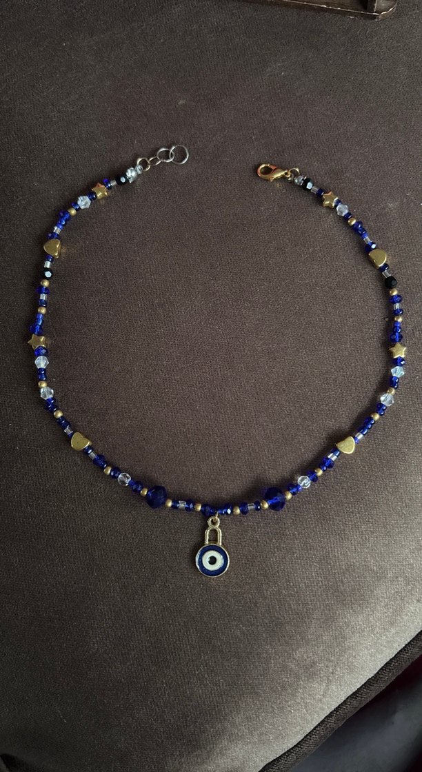 El yapımı lacivert ve gold detaylı nazar boncuklu kolye