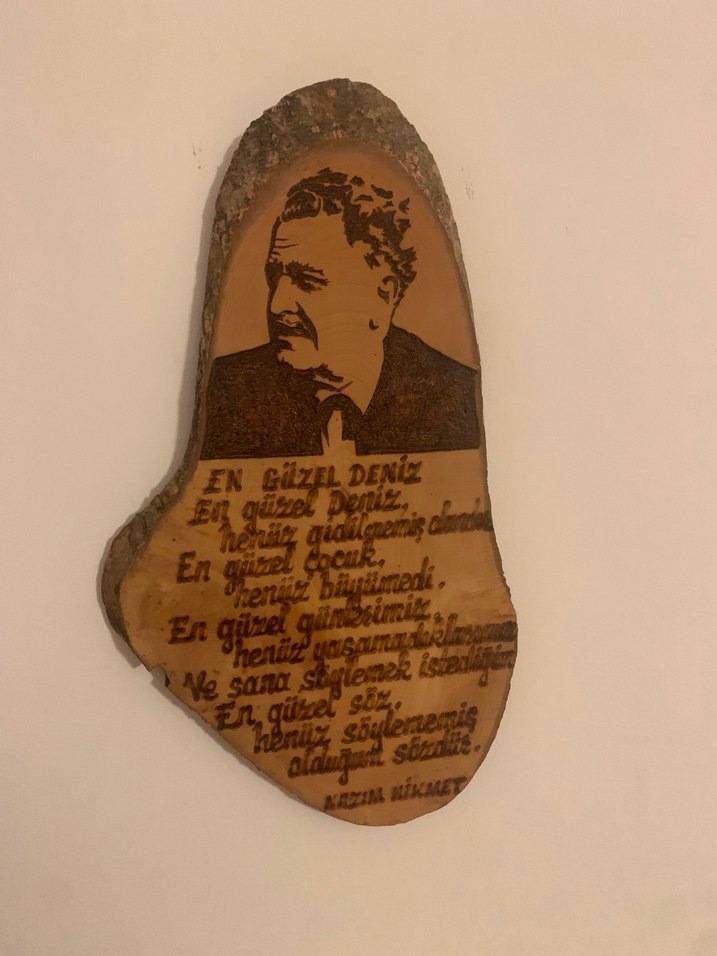 Nazım Hikmet'in portresi ve şiiri işlenmiş ahşap gravür, detaylı ve sanatsal bir tasarıma sahip. Amasra’dan almıştım, el yapımı olup oldukça kıymetlidir. Taşındığım için satiyorum.