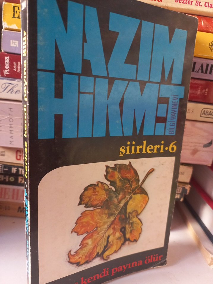 Nazım Hikmet'in 'Şiirleri 6' adlı kitabı, 'Kendi Payına Ölür' şiirlerini içerir. Kapakta renkli bir sonbahar yaprağı yer alır. NAZIM HİKMET ŞİİRLERİ 6- HERKES KENDİ PAYINA ÖLÜR (NAZIM HİKMET) 1.BASKI 188 sayfa
