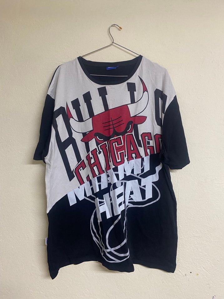 Pamuk kumaştan yapılmış, gevşek kesim, bisiklet yakalı, kısa kollu erkek tişörtü. Siyah ve gri renklerde, baskılı Chicago Bulls desenli ve tokalı detaylıdır. Normal boyda, spor ve günlük kullanım için uygundur.