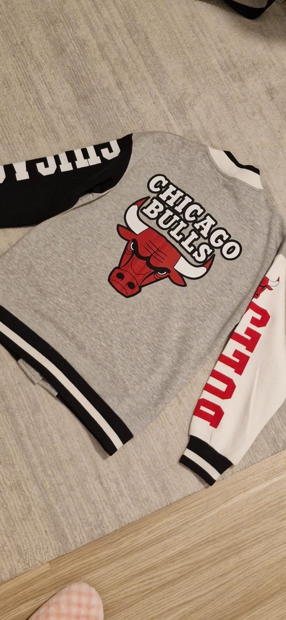 Gri pamuklu kumaştan, baskılı Chicago Bulls logosu bulunan, düğmeli ve uzun kollu, fitted kesim erkek sweatshirtü.
