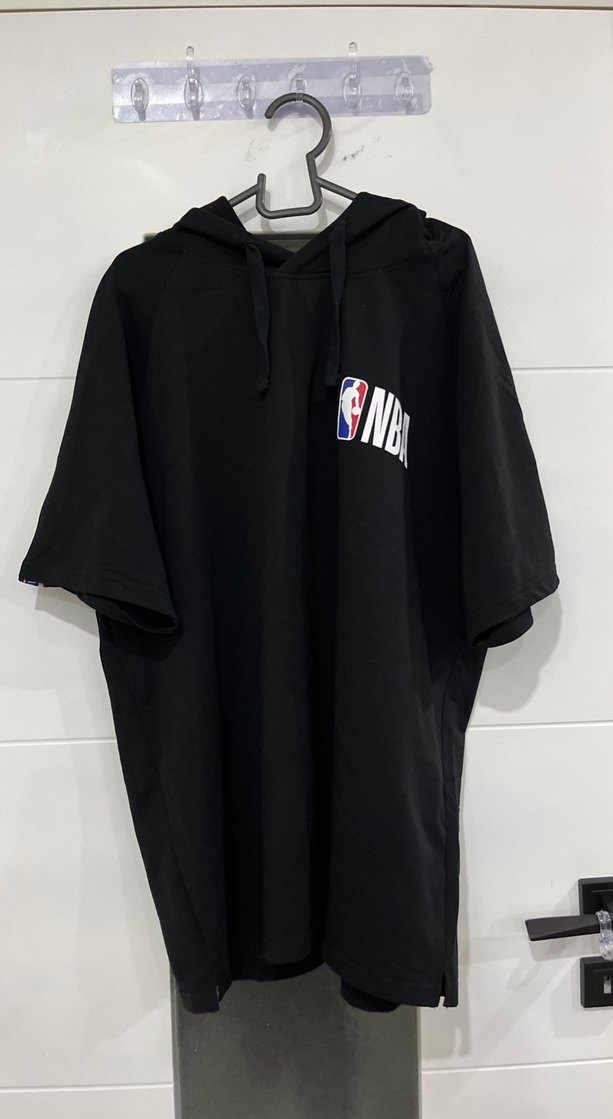 Kısa kollu, bisiklet yaka, drapeli ve baskılı NBA logolu siyah oversize tişört, spor için uygun.