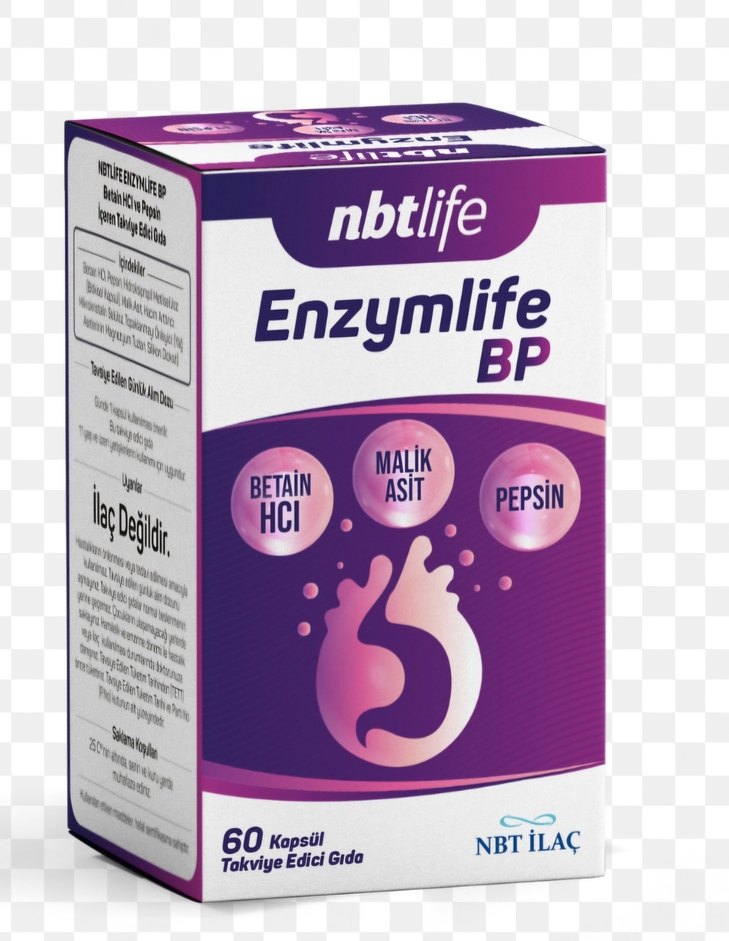NBTlife Enzymlife BP, betain HCl, malik asit ve pepsin içeren 60 kapsüllük takviye edici gıdadır.