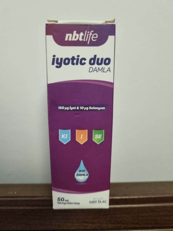 nbtlife iyotic duo Damla, 50 ml şişede 150 µg İyot ve 10 µg Selenyum içerir. Temel mineral desteği sağlar. Az kullanılmış