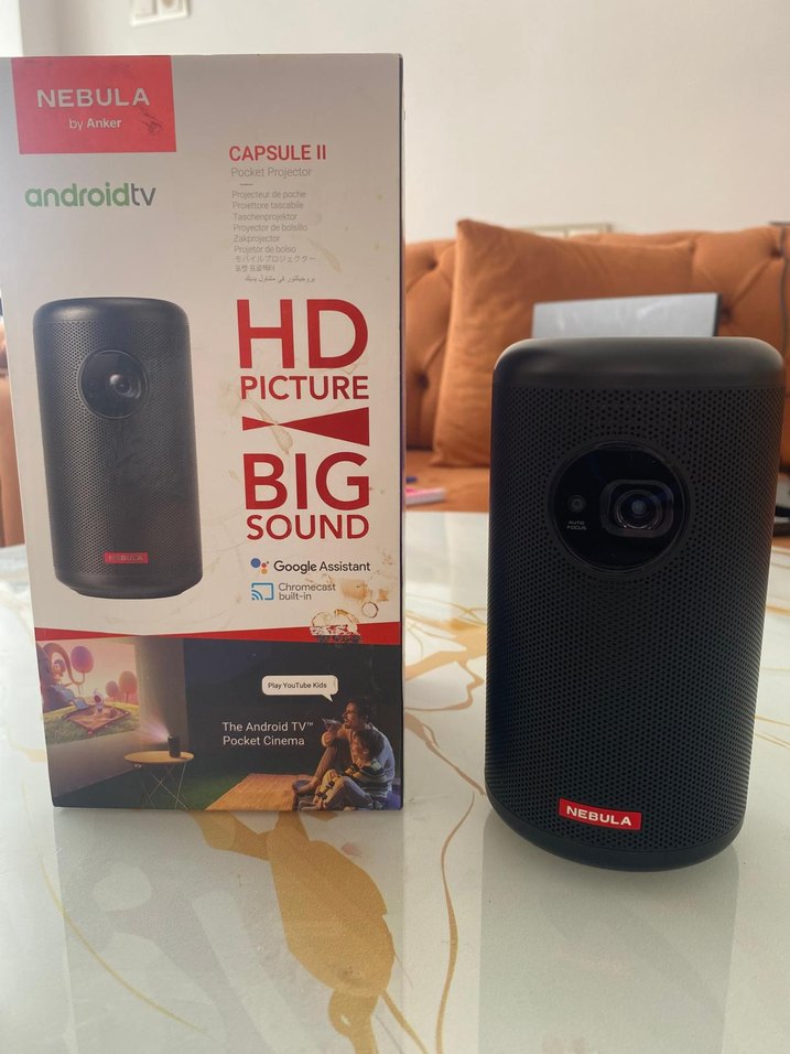 Nebula Capsule II Android TV mini projektör, kompakt siyah tasarımda HD görüntü ve güçlü ses sunar. Google Assistant ve Chromecast desteği ile eğlence sağlar. 2 yıl kullandık sorunsuz çalışıyor. Tripotla beraber verilecektir.