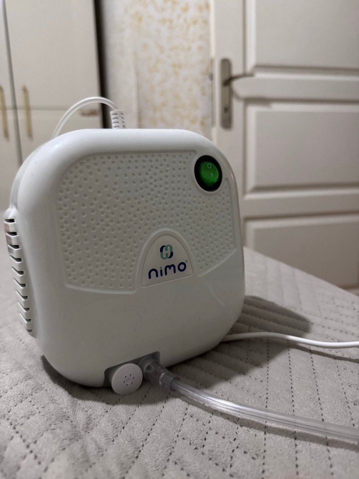 Beyaz renkli Nimo kişisel bakım cihazı, yeşil güç düğmesi ve gri havalandırmalı yüzey ile kompakt tasarıma sahiptir. Kullanıma uygun hortum bağlantısı bulunur. ⚙️ kutusu ile beraber gönderilecektir