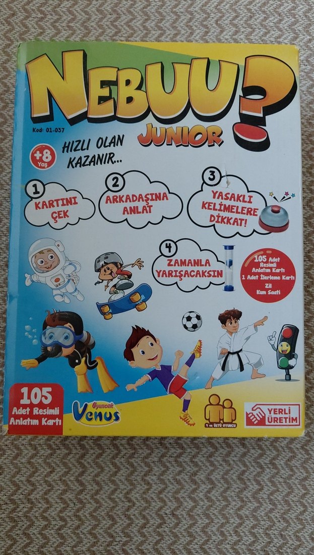 Nebuu Junior, 105 resimli kartla hızlı oynanan bir çocuk oyunudur. Kartını çek, arkadaşına anlat, yasak kelimelere dikkat et ve zamanla yarış. 8 yaş ve üzeri için uygun.