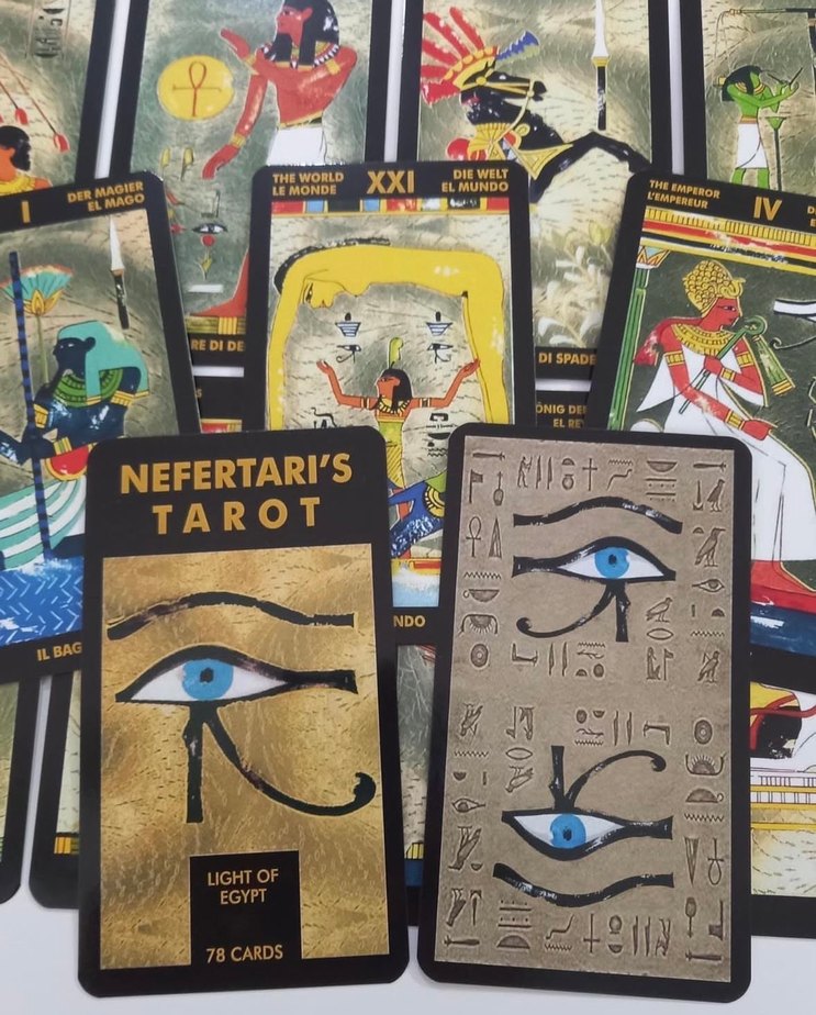 Nefertari'nin Tarot destesi, antik Mısır sembolleri ve sanatıyla ilham alınmış 78 karttan oluşur. Göze çarpan Horus Gözü tasarımı içerir.