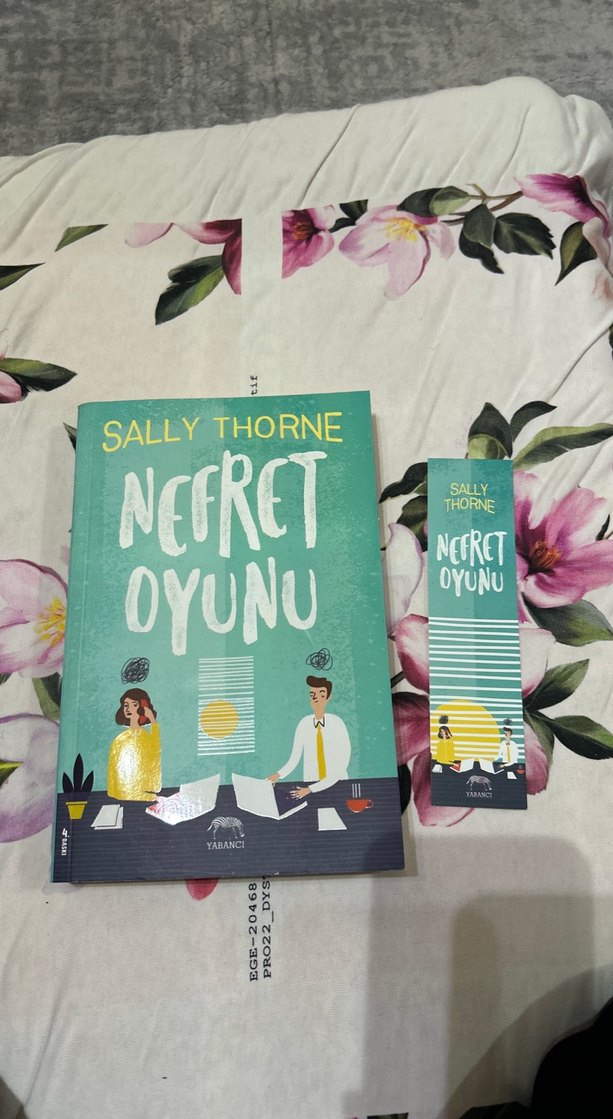 Sally Thorne'un 'Nefret Oyunu' kitabı, çizimli karakterler ve uyumlu çizgili ayraç ile turkuaz kapaklıdır. Sıfır