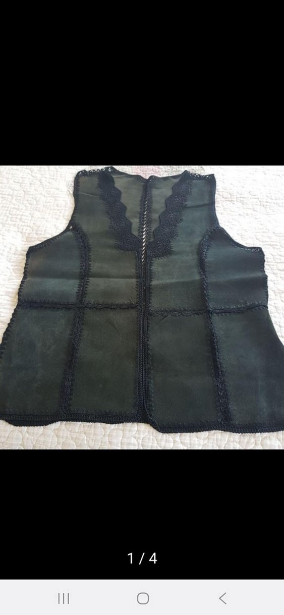 nefti yeşil süet kumaştan, fermuarlı, V yakalı ve kolsuz, gövdeye oturan midi uzunlukta kadın yelek. Gotik ve bohem tarzlar için uygundur.