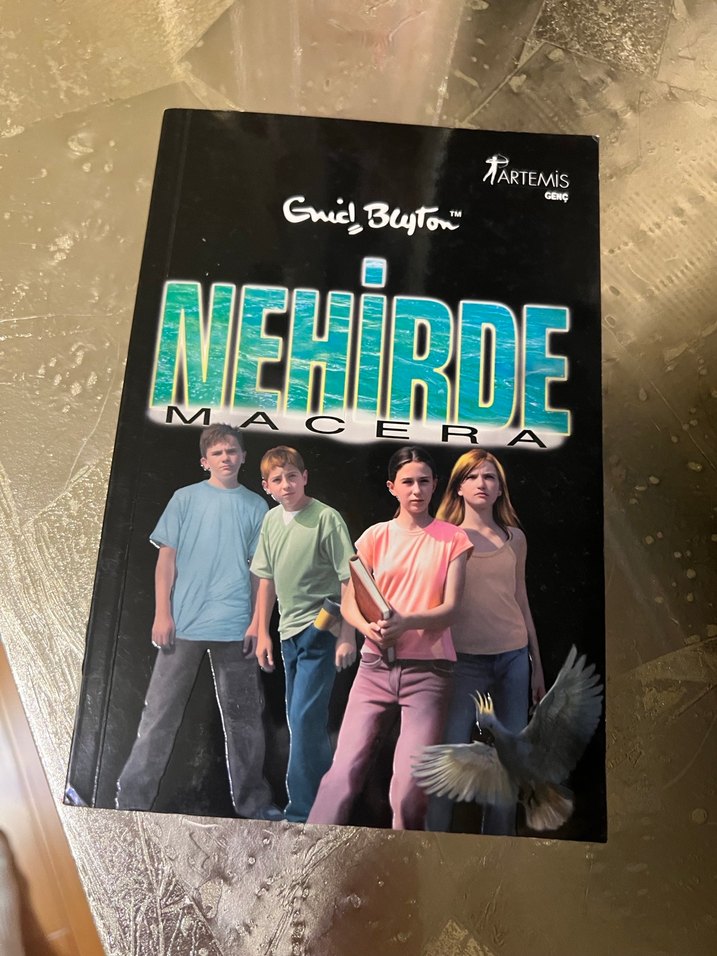 Enid Blyton'un "Nehirde Macera" kitabı, kapağında dört genç karakter ve uçan bir kuşla macera dolu bir hikaye sunuyor. Artemis yayınevinden.