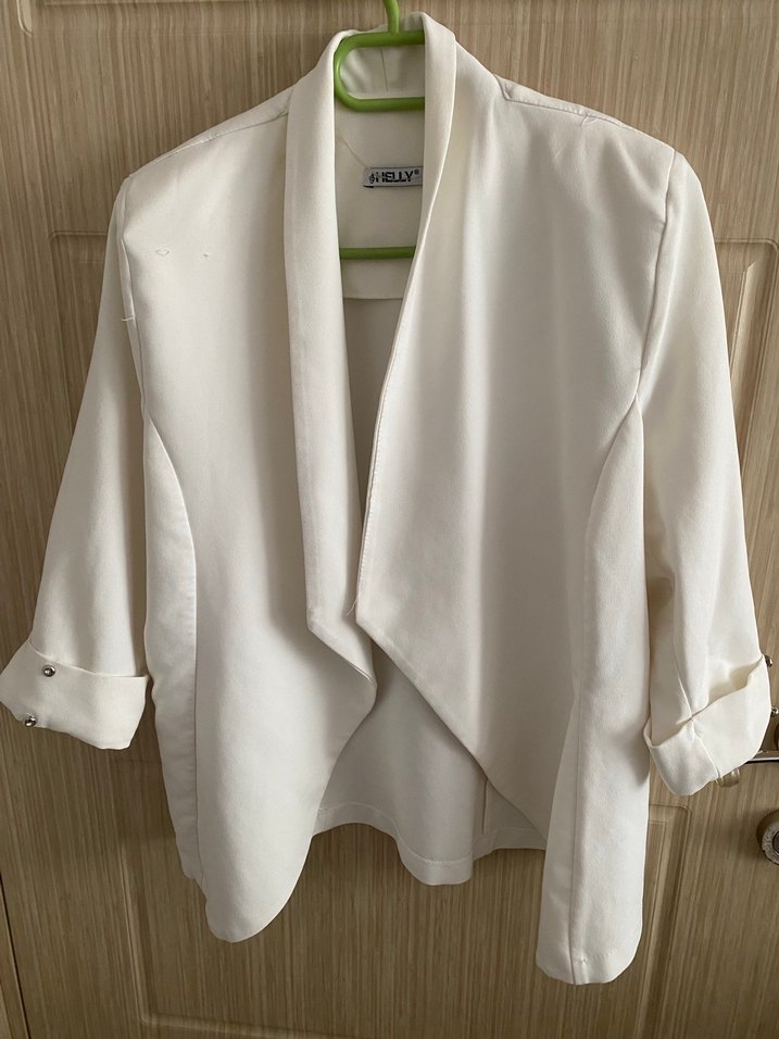 Nelly marka, keten kumaştan, düğmeli, klasik yaka ve uzun kollu beyaz kadın blazer ceket. Ofis için uygun, normal boyda ve regular fit.