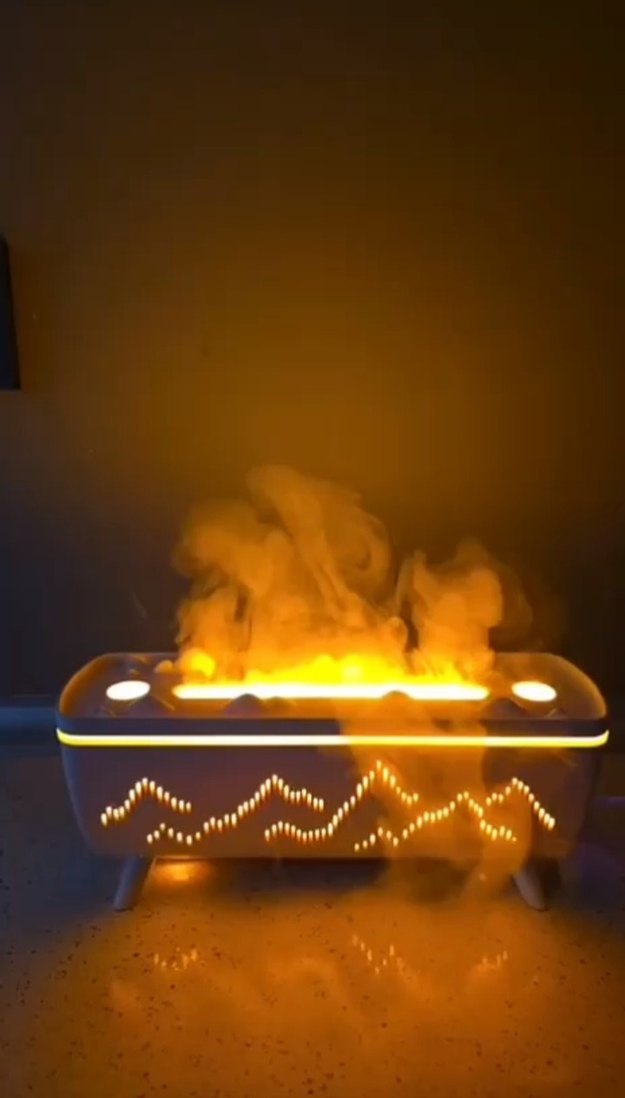 Oda nemlendirici;LED ışıkları ve su buharını kullanarak gerçekçi bir turuncu alev veya mavi buz alevi görüntüsü oluşturur. Gövde kısmında görselde görülen ışıklı dağ silüeti motifleri bulunur. Su haznesine uçucu yağlar eklenerek odaya güzel koku yayması sağlanır. Görsellerde görüldüğü gibi farklı renk seçenekleri (turuncu, mavi, mor/pembe) arasında geçiş yapılabilir.