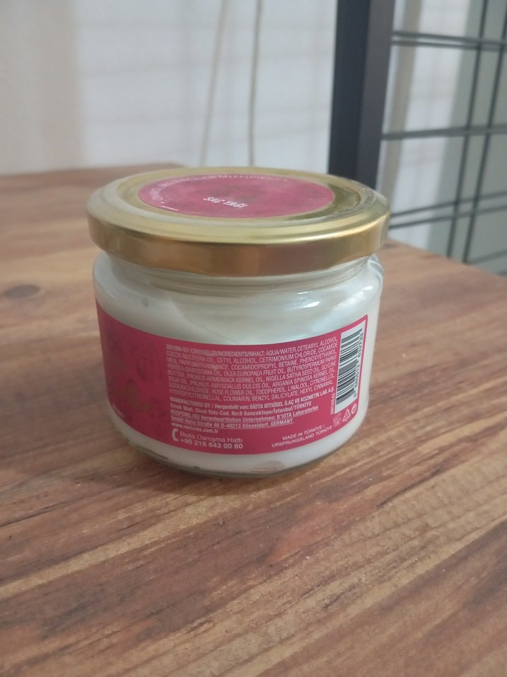 Altın kapaklı cam kavanozda, cildi nemlendiren vücut kremi. Krem kıvamında ve üzerinde ayrıntılı içerik bilgisi bulunur.