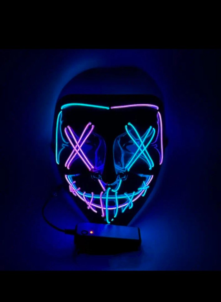 Mavi ve mor neon ışıklarla tasarlanmış yüz maskesi, küçük pil kutusuyla çalışır ve gece etkinlikleri için parlak bir görünüm sağlar. Boyutları ve videosu paylaşıldı. Güzel günlerde kullanmanızı dilerim.
