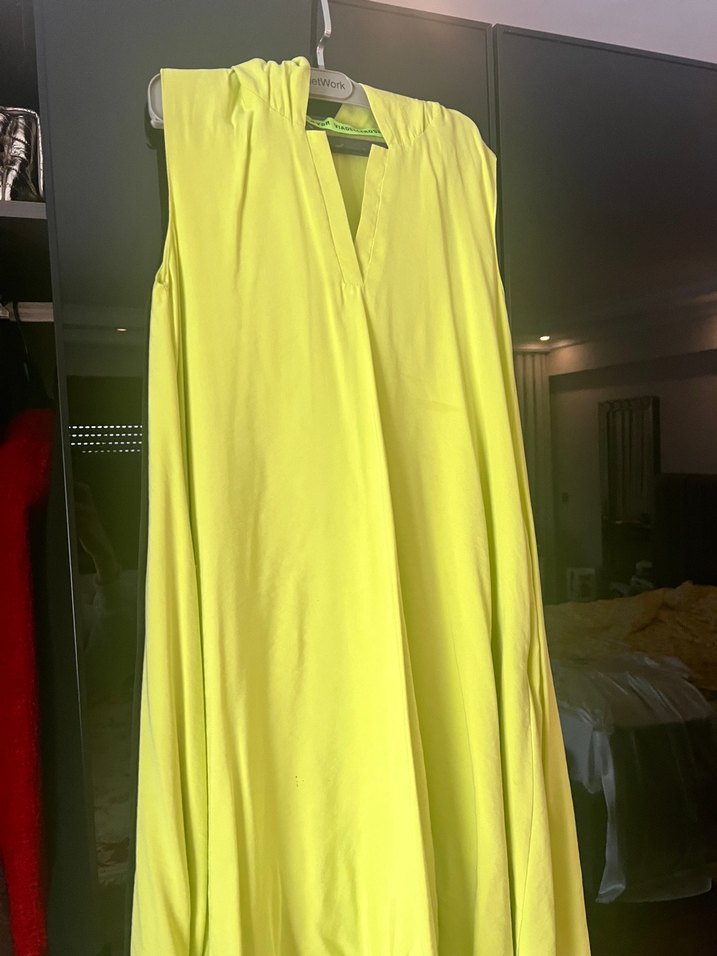 Neon renkte kolsuz, V yaka uzun elbise, drapeli tasarımı ve bol kesimi ile. İpeksi kumaştan, parlak ve minimalist tarzda, günlük kullanım için uygundur. Hamileler icin asiri rahat ve genis