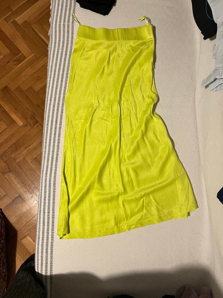 ZARA Parlak sarı sentetik kumaştan, uzun kesime sahip, fit bir kadın eteği. Sokak stili ve athleisure etkisi taşır. Günlük kullanım için uygundur.