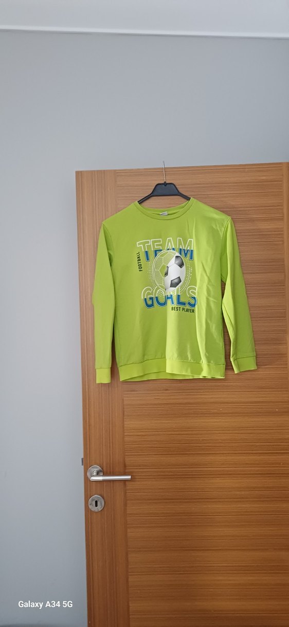 Neon yeşil renkli, uzun kollu, yuvarlak yakalı ve bol kesim erkek çocuk sweatshirtü. Renkli futbol temalı baskı ve düğme detayları bulunur. Yumuşak ve sıcak kumaş. ⚽