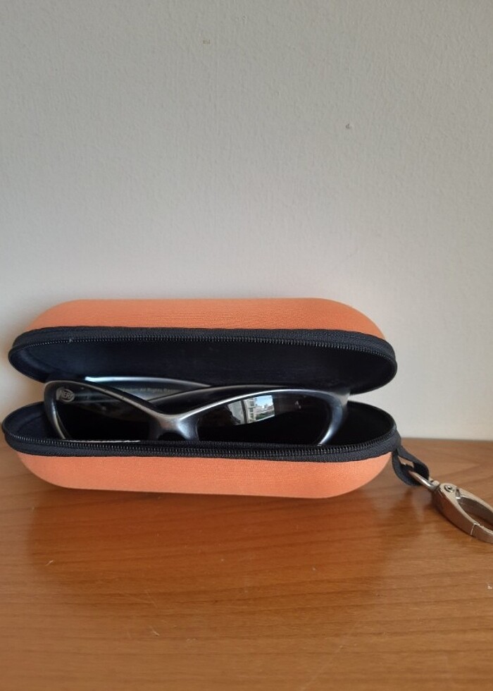 Nerf çocuk gözlük ve turuncu kılıfı. Kılıfının arkasında siyah leke var. Gözlük camı plastik, çizik yok, çerçevesinde ve sapında az sıyrıklar var. Kılıfın Fermuarı sağlam.