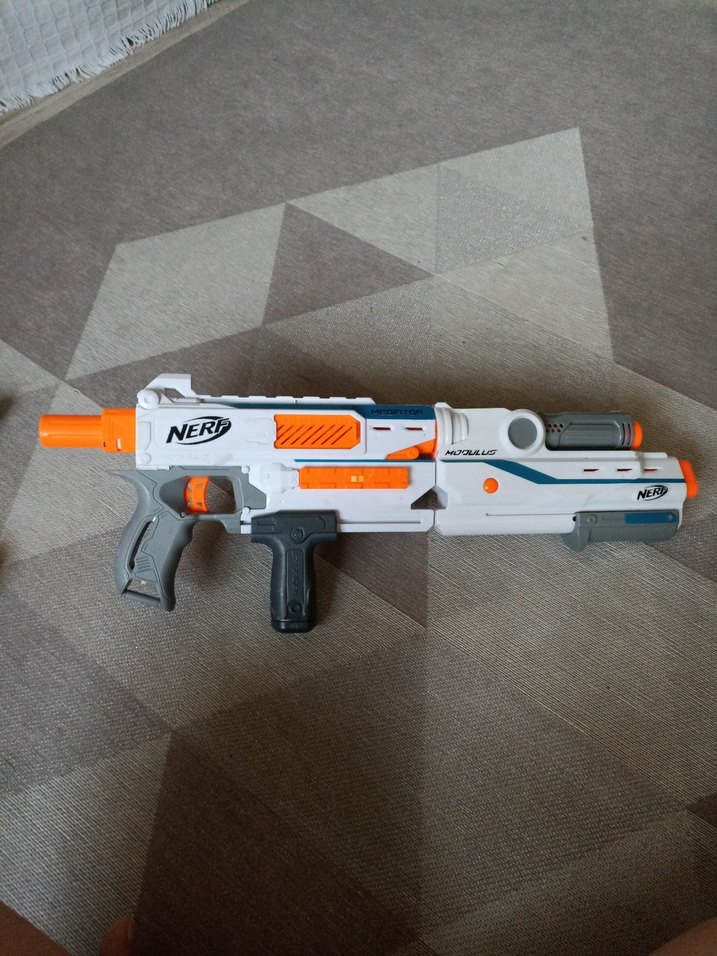 Beyaz ve gri renkte, turuncu detaylı "NERF" logosu bulunan oyuncak tabanca. Tetik ve tutma sapı mevcuttur.Yanında NERF mermisi vardır.