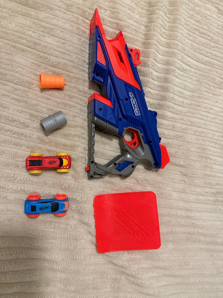 Nerf Nitro Mavi ve kırmızı renkli oyuncak tabanca, fırlatma için iki küçük oyuncak araba, ve kırmızı hedef rampası mevcuttur
