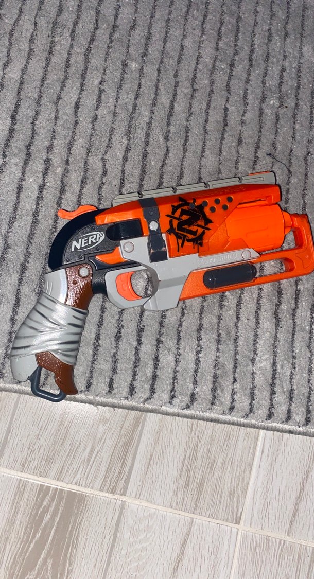 Gri ve turuncu renkli Nerf oyuncak tabanca, detaylı tutma yeri ve kompakt tasarıma sahiptir. Tetik ve dekoratif işaretler içerir.