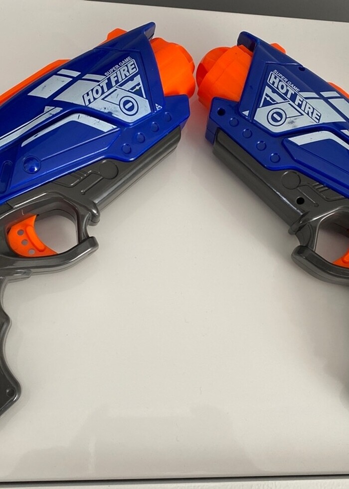 Nerf Nişancı 5 yumşak sünger atan tabanca. Ürünün her ikisindede hiçbir şekilde çalışmayan bir aksamı yoktur. Hafif yazılarında görsel olarak silinmeler mevcut.