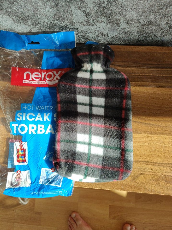 Sıcak tutan gri ekoseli yumuşak kaplamalı sıcak su torbası. Rahatlatıcı kullanım için uygundur.