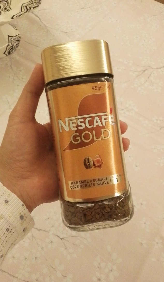 Nescafe Gold karamel aromalı, çözünür kahve. Parlak altın renkli ambalajda, zengin aromalı kahve deneyimi sunar. ☕