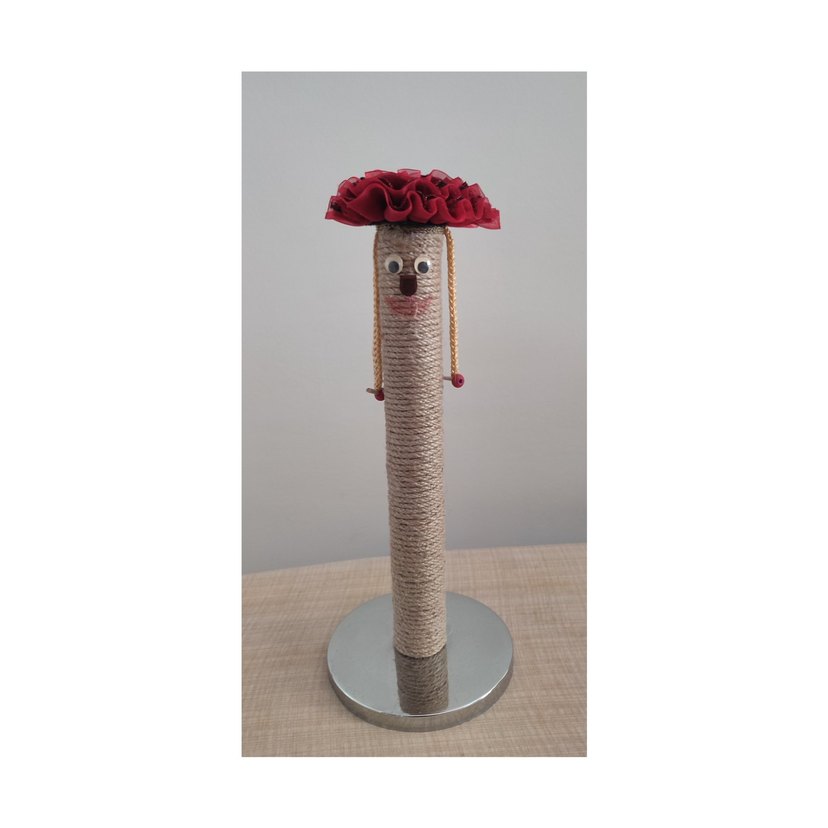 IKEA sağlam çelik ayna tabanlığı 15 cm. çaplı, 36,5 cm. yükseklikte (~2 cm. taban yüksekliği) kedi tırnak bileyicisi. Palyaço gözleri hareketli, kırmızı fırfırlı şapkalı, kolları oyun için uygun, burnu hariki deriden yapılmıştır. Taban içi ağır alçı dolgulu olduğu için sağlam, sabit bir şekilde durmaktadır. Kendi kedim için özel malzemelerle tasarlattım. Fakat o koltuj tercih ediyor El yapımı dolayısı ile malzeme masrafına göre uygun fiyatlıdır. Oyuncu kumaş üst kısmı ve sallanan boncuklarla eğlenceli tasarım sunar.